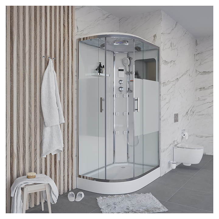 Душевая кабина Niagara Ultra NG-303-01R предназначена для использования в ванных комнатах. Благодаря изящной форме и изысканному дизайну кабина станет украшением ванной комнаты, а угловая конструкция ассиметричной формы легко впишется на небольшой площади. Душевая кабина оснащена 2х секционными раздвижными дверями, крышей, верхнем душем, пультом управления с радио, гидромассажем, зеркалом и полочкой. Профиль изготовлен из анодированного алюминия в хроме, двери из закаленного прозрачного стекла с матовой линией, задняя стенка и центральная панель - из белого закаленного стекла. Комплектация: