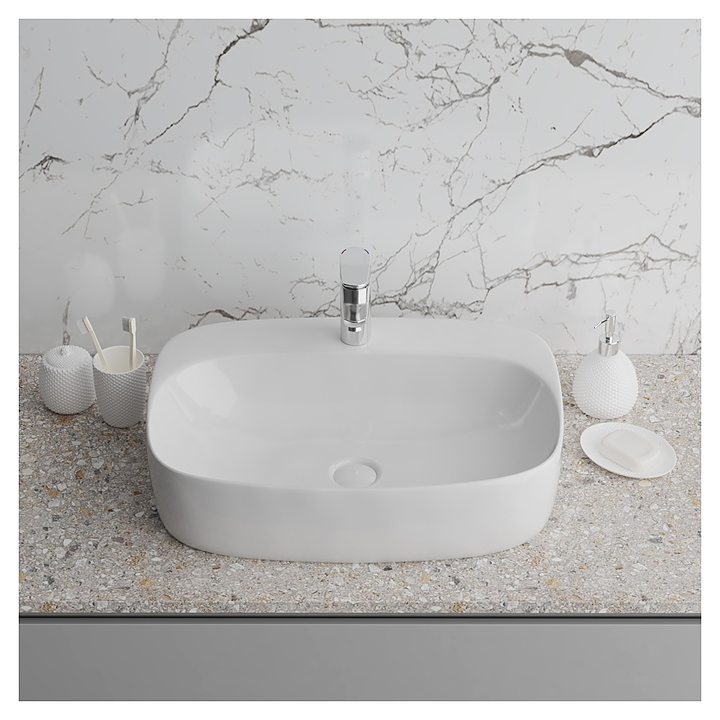Накладная раковина Grossman GR-3027 59,5x42,5 см дополнит интерьер любой ванной комнаты. Накладная конструкция изделия позволяет произвести быстрый монтаж, экономит место и обеспечивает изящный внешний вид. Чаша имеет закругленные углы для облегчения процесса очищения от загрязнений. Изделие выполнено из фаянса, который обладает повышенной прочностью и устойчивостью к негативным внешним факторам, а так же долгое время сохраняет идеальную белизну и не впитывает запахи и грязь. Донный клапан и смеситель в комплект поставки не входят и приобретаются отдельно. Особенности: