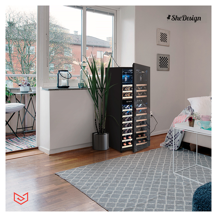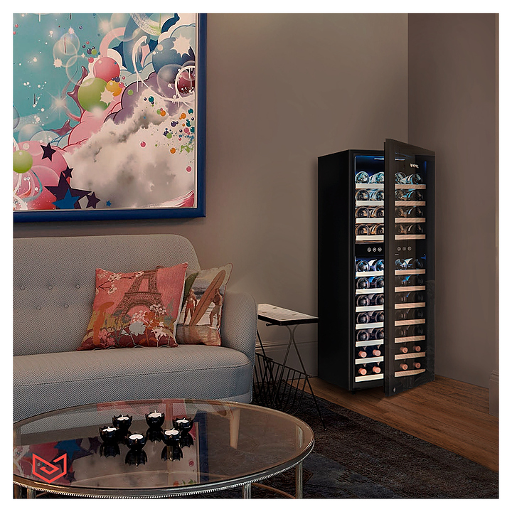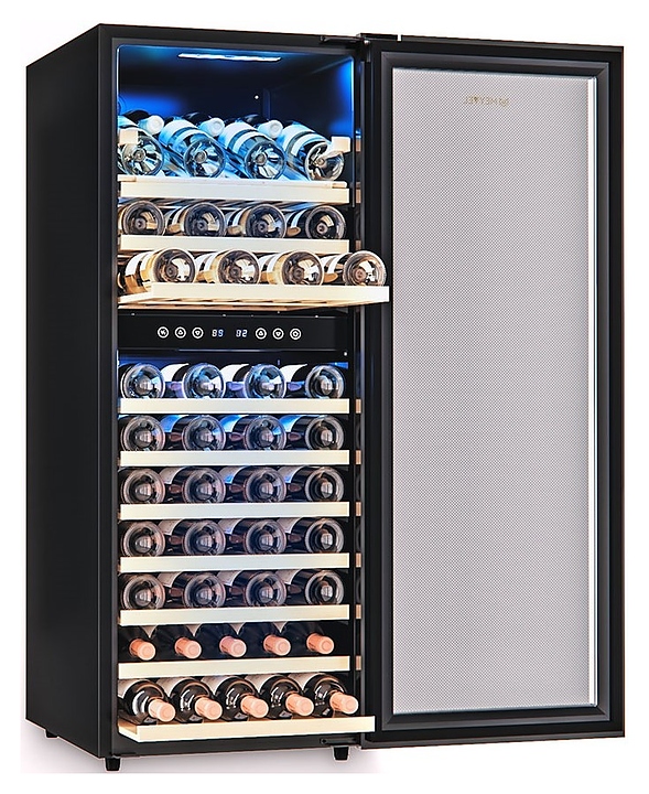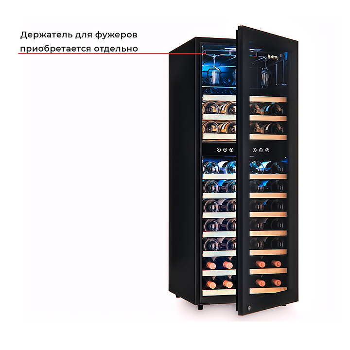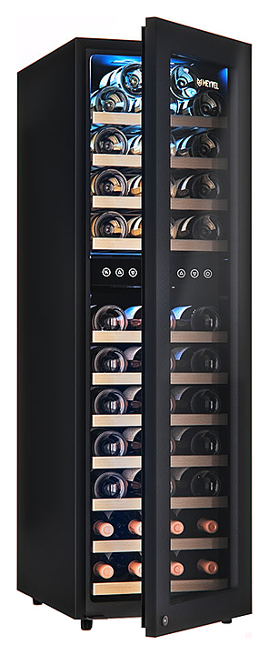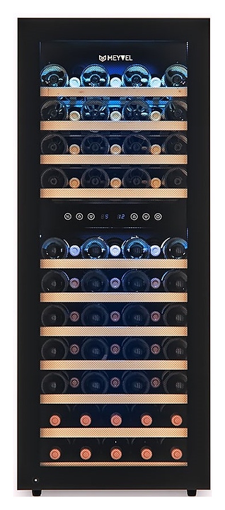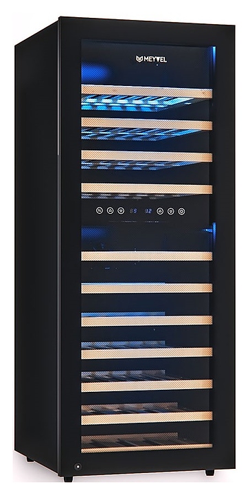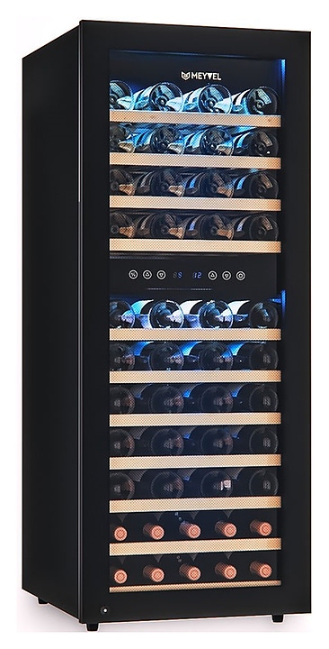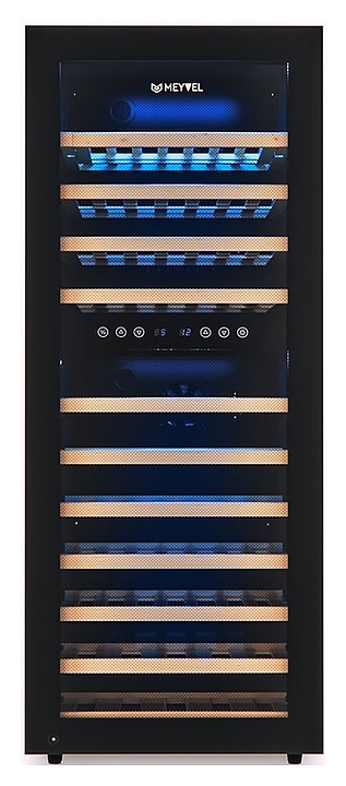 Винный шкаф MEYVEL MV73-KBF2 предназначен для демонстрации, хранения и создания оптимальных условий для сохранения всех вкусовых свойств вина в бутылках на предприятиях общественного питания, торговли, в барах, ресторанах, специализированных магазинах, частных домах или квартирах. Модель оснащена сенсорной панелью управления, электронным термостатом и светодиодной подсветкой синего цвета в каждой зоне. Корпус выполнен из окрашенной в черный цвет стали, дверь - из черной рамы и тонированного стекла с защитой от ультрафиолетовых лучей, полки - из массива бука. Особенности: