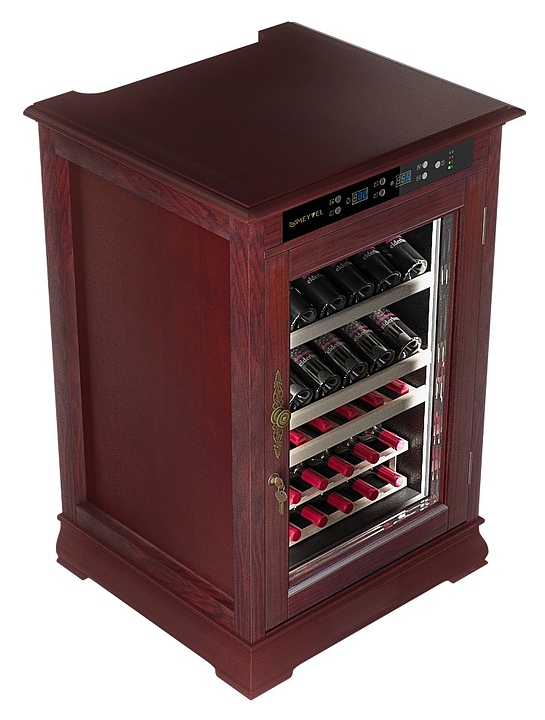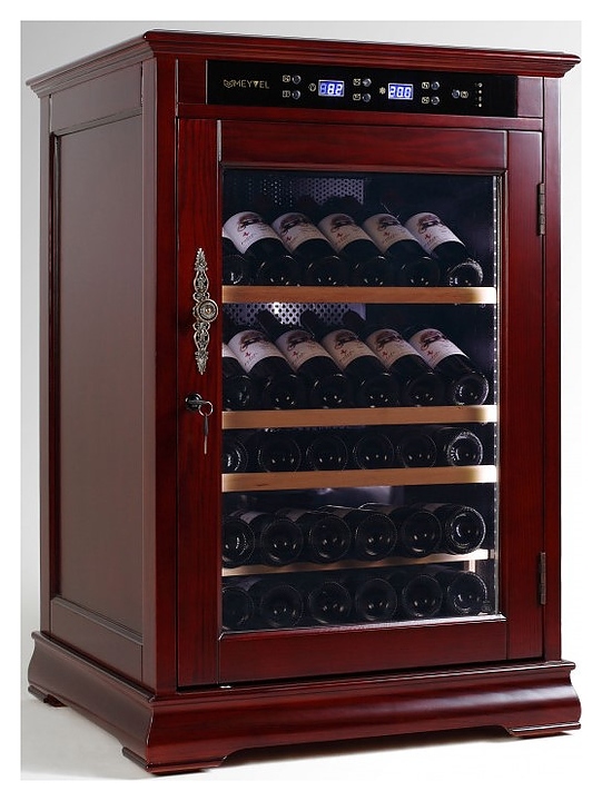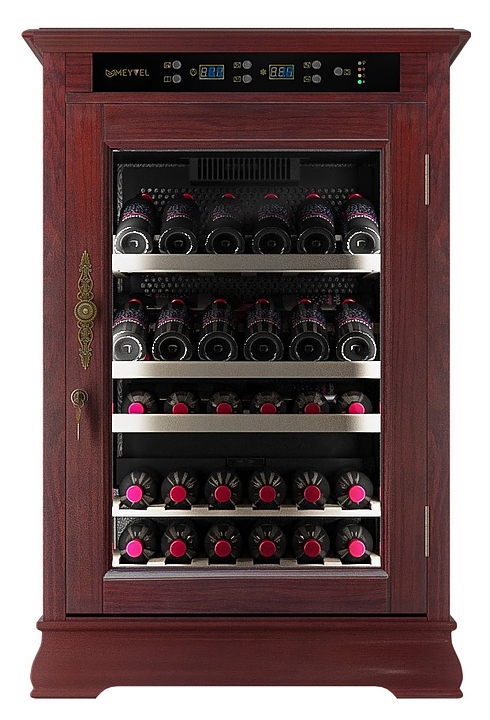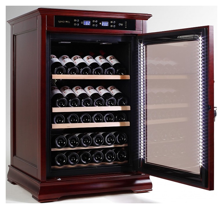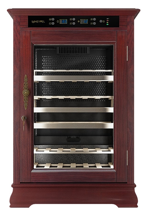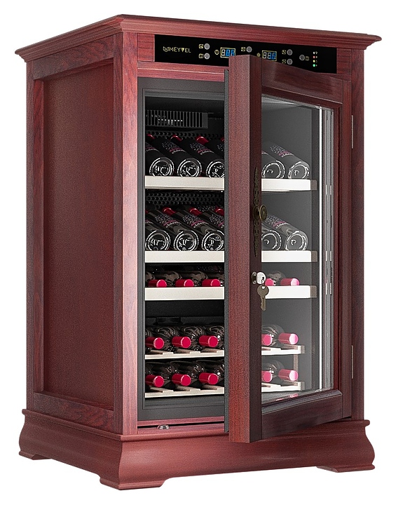 Винный шкаф MEYVEL MV46-WM1-C предназначен для демонстрации, хранения и создания оптимальных условий для сохранения всех вкусовых свойств вина в бутылках на предприятиях общественного питания, торговли, в барах, ресторанах, специализированных магазинах, частных домах или квартирах. Модель оснащена сенсорной панелью управления, электронным термостатом и светодиодной подсветкой. Корпус выполнен из обшитой деревом стали, дверь - из деревянной рамы и двойного стекла с защитой от ультрафиолетовых лучей, полки - из массива бука. Особенности: