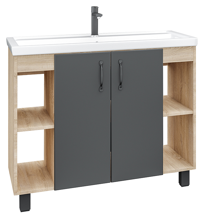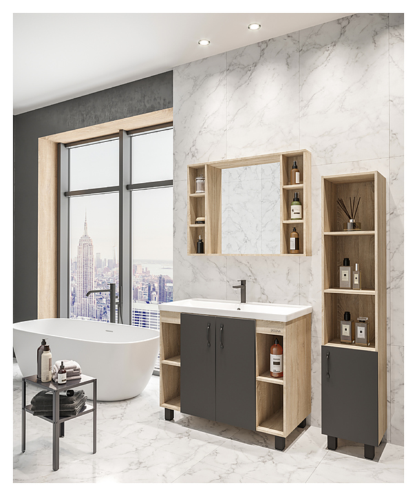 Тумба Grossman Флай 101002 100 см отлично дополнит интерьер любой ванной комнаты. Изделие устанавливается на ножки, что позволяет защитить конструкцию от воздействия влаги в случае намокания пола, а также облегчает уборку. Корпус изготовлен из ЛДСП, которая отличается долговечностью и экологичностью, а также предохраняет от загрязнения и защищает от влаги. Фасад выполнен из МДФ в матовой пленке, которая придает изделию красивый внешний вид. Тумба может использоваться вместе с раковиной Kirovit Фостер 100 см. В комплект поставки входит набор креплений. Особенности: