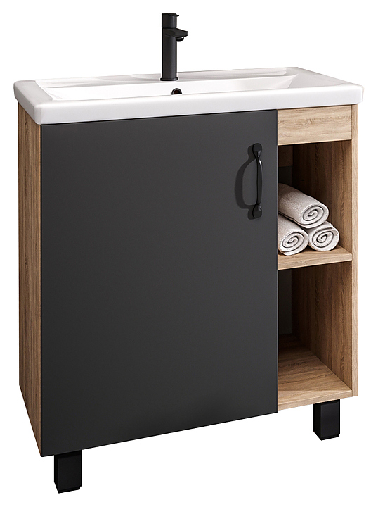 Тумба Grossman Флай 107002 70 см отлично дополнит интерьер любой ванной комнаты. Изделие устанавливается на ножки, что позволяет защитить конструкцию от воздействия влаги в случае намокания пола, а также облегчает уборку. Корпус изготовлен из ЛДСП, которая отличается долговечностью и экологичностью, а также предохраняет от загрязнения и защищает от влаги. Фасад выполнен из МДФ в матовой пленке, которая придает изделию красивый внешний вид. Тумба может использоваться вместе с раковиной Kirovit Фостер 70 см. В комплект поставки входит набор креплений. Особенности: