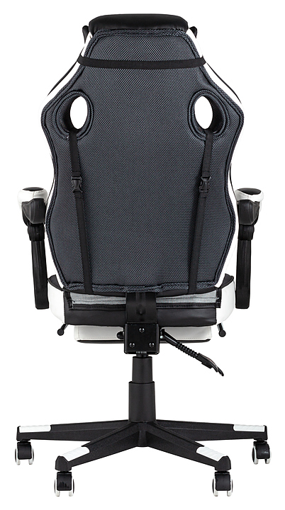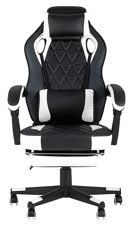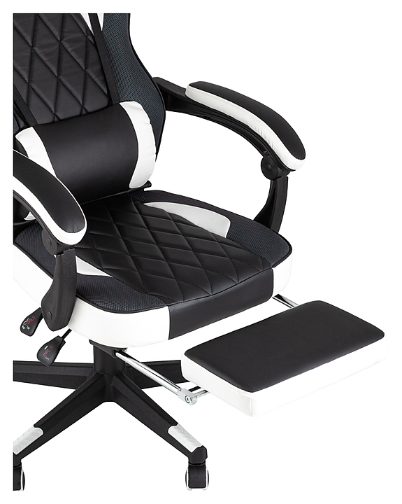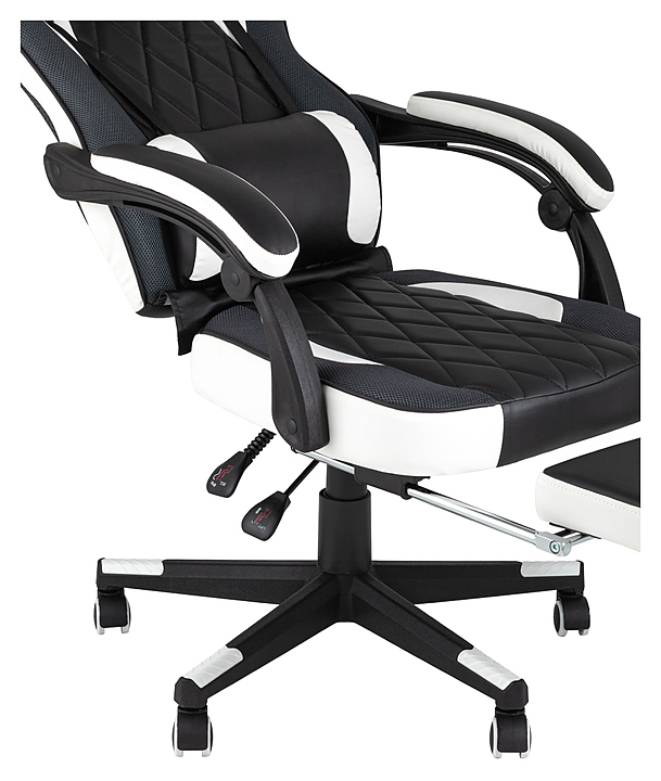 Спортивное компьютерное кресло TopChairs Virage черное с белым предназначено для долгой работы или игры за компьютером на даче, дома, а также в офисах. Модель оснащена полиуретановыми колесами, подлокотниками, механизмом качания TopGun, системой регулировки по высоте газ лифт III класса, ортопедическими подушками для поддержки шеи и пояса, а также выдвижной подставкой под сиденьем, которая позволяет положить на нее ноги и достичь максимального комфорта. Крестовина кресла изготовлена из нейлона, подлокотники из пластика, обивка из экокожи. Дополнительные характеристики: