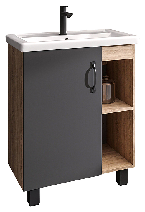 Тумба Grossman Флай 106002 60 см отлично дополнит интерьер любой ванной комнаты. Изделие устанавливается на ножки, что позволяет защитить конструкцию от воздействия влаги в случае намокания пола, а также облегчает уборку. Корпус изготовлен из ЛДСП, которая отличается долговечностью и экологичностью, а также предохраняет от загрязнения и защищает от влаги. Фасад выполнен из МДФ в матовой пленке, которая придает изделию красивый внешний вид. Тумба может использоваться вместе с раковиной Kirovit Фостер 60 см. Особенности: