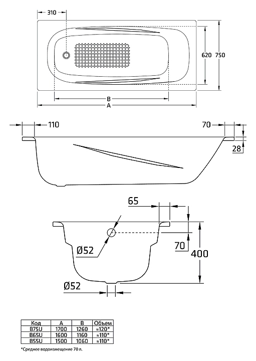 Ванна BLB UNIVERSAL ANATOMICA B75U 170x75 см, под прикручивающиеся ножки, сталь