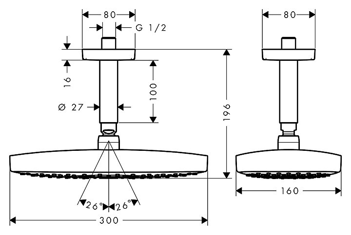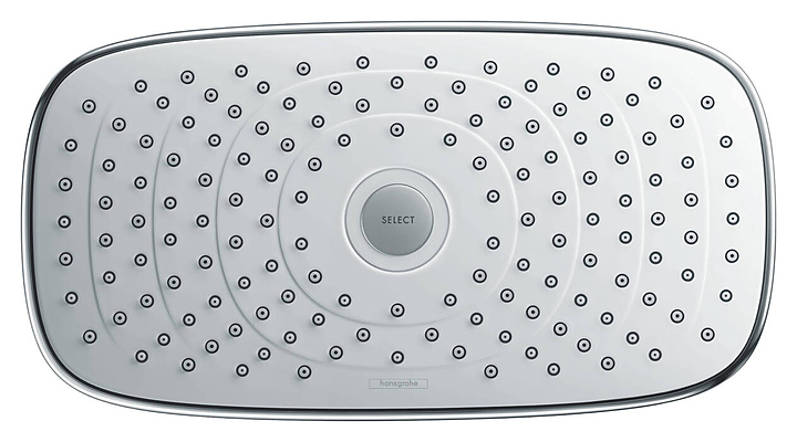 Верхний душ Hansgrohe Raindance Select Е300 2jet 27384400 благородаря дизайну и продуманным функциям доставляет необыкновенное наслаждение от принятия душа на высочайшем уровне. Модель имеет душевую головку прямоугольной формы и образует впечатляюще большую зону принятия душа. Известковый налет на силиконовых форсунках с легкостью удаляется благодаря технологии QuickClean, достаточно слегка потереть и структура струи снова идеальна. Душ предусматривает монтаж на потолок. В комплект поставки входит верхний душ, потолочное подсоединение. Особенности: