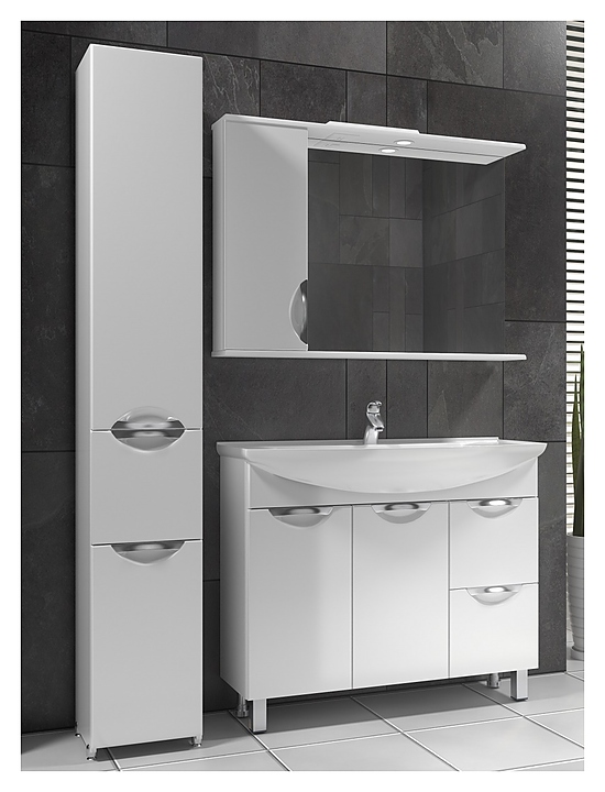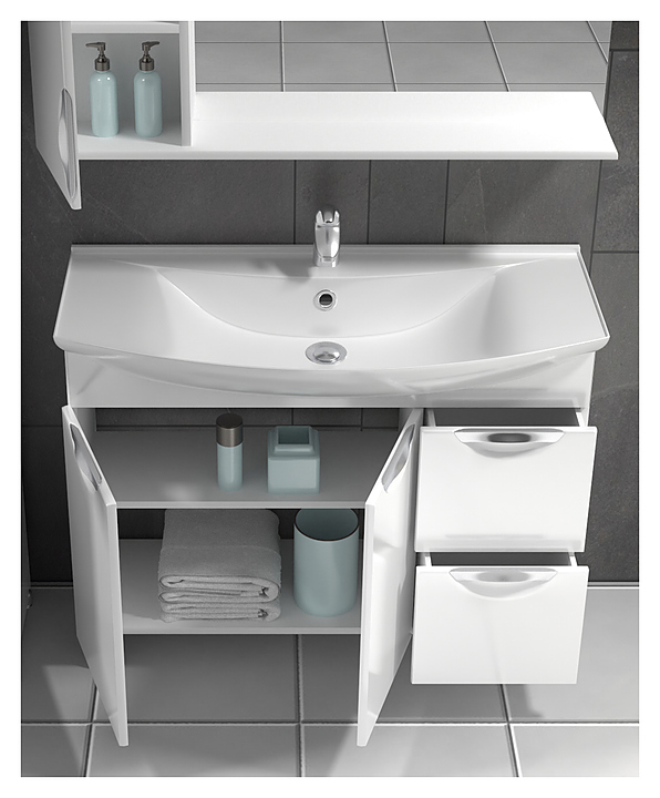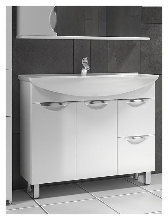 Тумба под раковину VIGO Callao 1050 выполнена в современном стиле и прекрасно впишется в интерьер любой ванной комнаты. Модель оснащена двумя отделения для хранения с дверцами и двумя ящиками с напрявляющими полного выдвижения. Корпус изделия выполнен из влагостойкой ЛДСП. Фасад изделия выполнен из ЛМДФ с глянцевой пленкой ПВХ. Тумба может использоваться вместе с раковиной Kirovit Стиль 105. Раковина и смеситель в комплект поставки не входят и приобретаются отдельно. Комплектация: