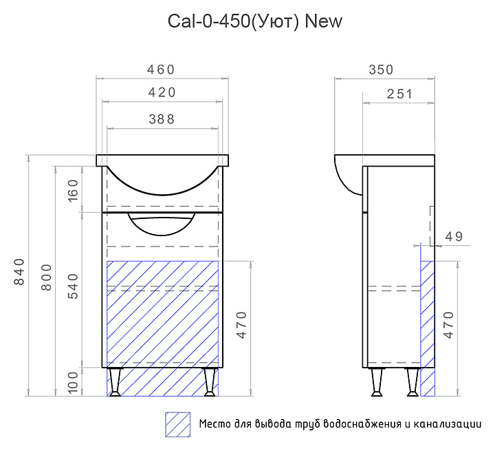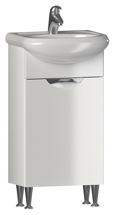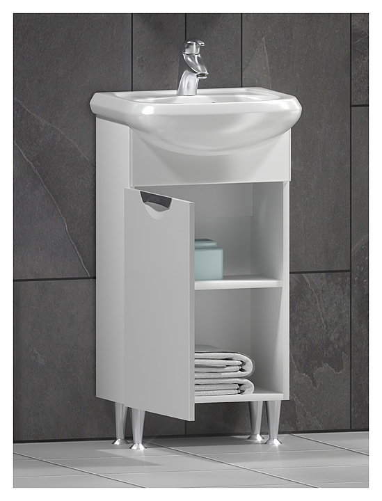 Тумба под раковину VIGO Callao 45 выполнена в современном стиле и прекрасно впишется в интерьер любой ванной комнаты. Модель оснащена двумя отделения для хранения с дверцей. Корпус изделия выполнен из влагостойкой ЛДСП с матовым покрытием. Фасад изделия выполнен из ЛМДФ с глянцевой пленкой ПВХ. Тумба может использоваться вместе с раковиной Уют 45. Раковина и смеситель в комплект поставки не входят и приобретаются отдельно. Комплектация: