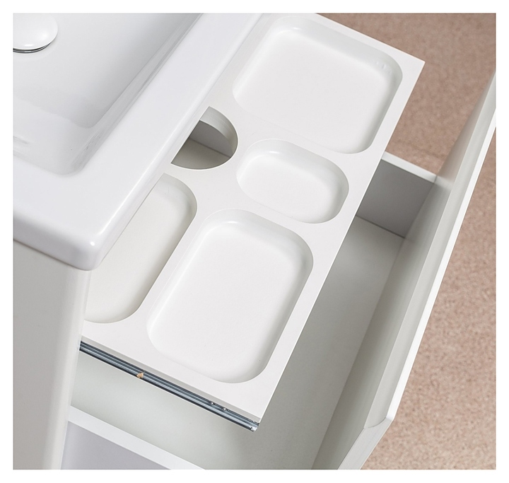Тумба Velvex KLAUFS 60.2Y tpKLA.60.2Y-616.216 выполнена в современном стиле. Благодаря подвесной конструкции изделие не занимает много места и обеспечивает легкую уборку в ванной комнате. Модель оснащена выдвижным ящиком, за которым находится выдвижной органайзер и вместительным ящиком полного выдвижения в нижней части тумбы. Корпус изделия выполнен из высококачественной МДФ в матовой плёнке белого цвета, а фасады из МДФ в отделке HPL пластик глянцевый, что обеспечивает изделию привлекательный внешний вид, а также износостойкость и долговечность. В комплект поставки входит комплект крепежа для крепления к стене. Раковина и смеситель в комплект поставки не входят и приобретаются отдельно. Особенности: