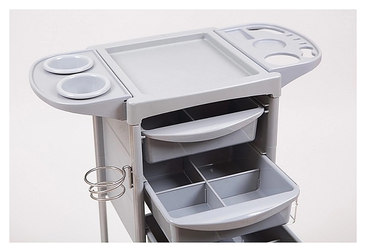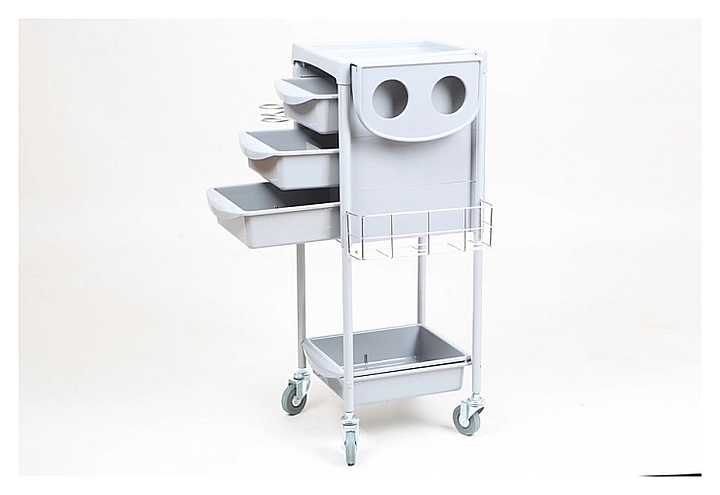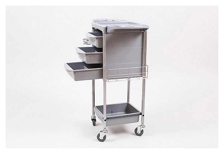 Парикмахерская тележка SunDream SD-3016A используется в парикмахерских, салонах красоты и тату салонах для размещения инструментов, аппаратов, средств и прочих аксессуаров, рационализации рабочего пространства мастером и создания комфортных условий для мастера и для клиента. Такое оборудование позволяет держать все необходимое под рукой и правильно организовать рабочее место. Модель оснащена 1 полкой, большими, свободно вращающимися колесами для мобильности, и съемной нижней корзиной. Каркас выполнен из хромированного металла, ящики и навесные элементы - из ударопрочного пластика, держатель для фена - из металла. Особенности: