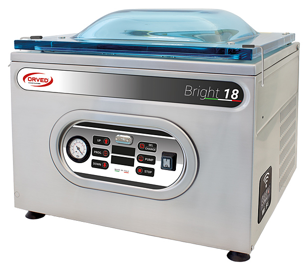 Вакуумный упаковщик Orved Bright 18 используется на предприятиях пищевой промышленности и общественного питания для вакуумной упаковки продуктов питания, жидкостей и готовых блюд. Модель оснащена водонепроницаемой цифровой панелью управления со специальным защитным покрытием. Корпус выполнен из нержавеющей стали AISI 304, камера - из гидроформованной нержавеющей стали AISI 304, крышка - из оргстекла. В комплект поставки входят стандартный аксессуар Easy для внешнего вакуумирования в пакетах с тиснением и 2 пластиковые наполнительные пластины для подгонки продукта и ускорения цикла. Особенности:
