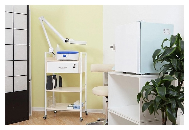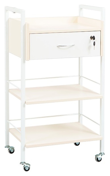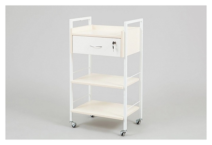 Косметологический столик Mertz ТК-1 используется в салонах красоты, тату и маникюрных салонах, СПА-центрах, парикмахерских, и медицинских кабинетах для размещения инструментов, аппаратов, средств и прочих аксессуаров, и рационализации рабочего пространства мастера. Такое оборудование позволяет держать все необходимое под рукой и правильно организовать рабочее место. Модель оснащена специальным креплением для лампы-лупы, ящиком, закрывающимся на ключ, 2 полками с бортиками для размещения оборудования и инструментов, и большими, прорезиненными колесами для мобильности. Каркас выполнен из надежной стальной конструкции. Особенности: