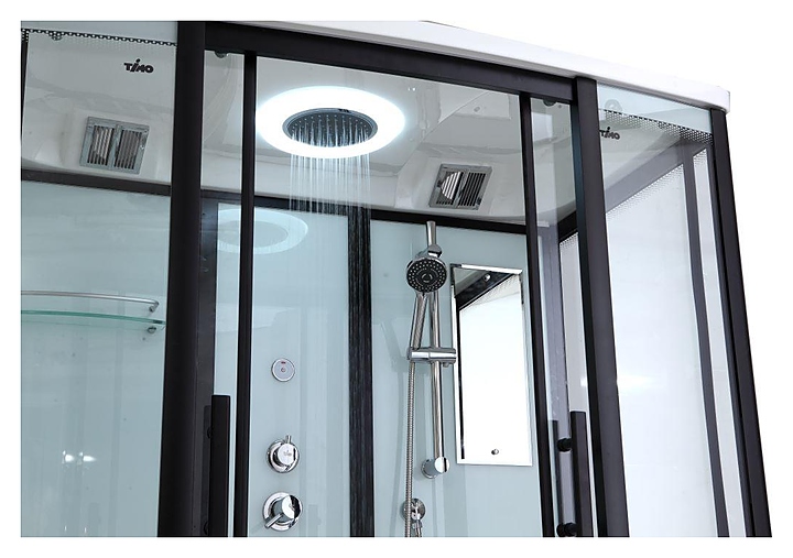 Душевая кабина TIMO Standart Т-6670 Black предназначена для использования в ванных комнатах. Модель оснащена крышей, высоким поддоном на усиленном металлическом каркасе, встроенным подголовником, термостатическим смесителем с ручной лейкой и тропическим душем, регулируемой по высоте штангой, встроенным сиденьем, подсветкой, полочкой и зеркалом. Поддон выполнен из качественного акрила, устойчивого к механическим повреждениям, обладающего высокой теплоемкостью, небольшим весом и повышенной шумоизоляцией. Особенности:
