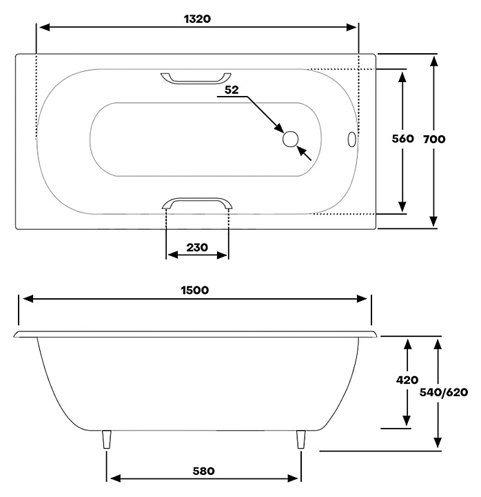 Ванна BYON B13 150x70x42 см с ручками, чугун