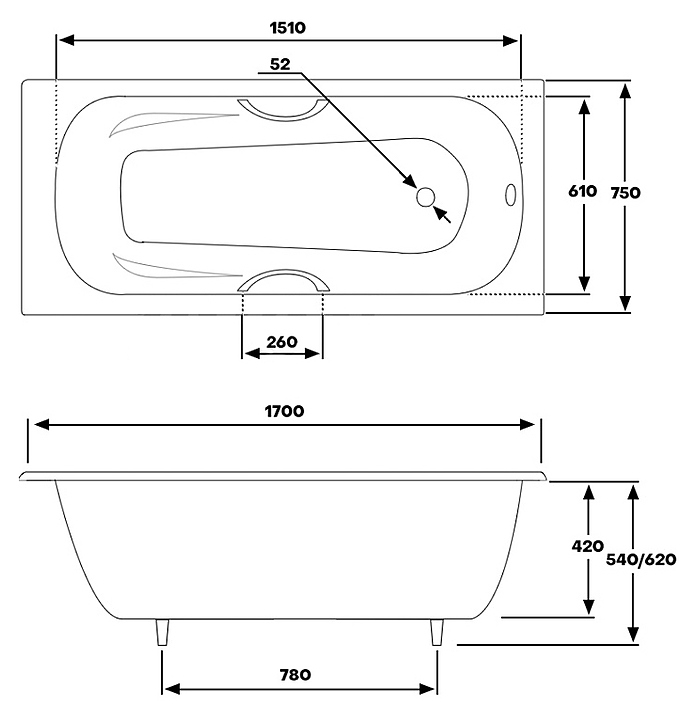 Ванна BYON B15 170x75x42 см с ручками, чугун
