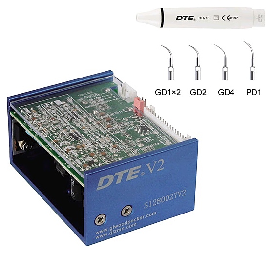 Ультразвуковой встраиваемый скайлер Woodpecker DTE-V2 используется в стоматологических кабинетах и клиниках для снятия никотинового налета, удаления зубного камня, кюретажа пародонтальных карманов, эндодонтического лечения, а также для профилактики и лечения заболеваний мягких тканей ротовой полости. Насадки изготовлены из нержавеющей стали. Комплектация: