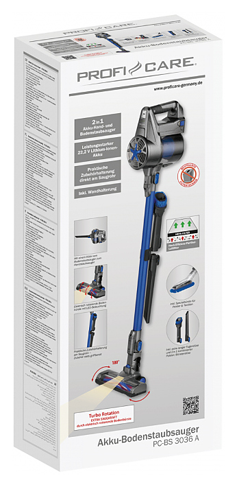 Аккумуляторный пылесос ProfiCare PC-BS 3036 A предназначен для обработки полов, ковров, мягкой мебели и других поверхностей в частных домах, квартирах, отелях и офисах. Модель оснащена настенным креплением, мягкой прорезиненной ручкой и всасывающей трубкой из алюминия. В комплект поставки входят электрическая вращающаяся щетка для пола, щетка для обивки и текстиля, щетка 2 в 1 для обивки/щетки и длинная щелевая насадка. Особенности: