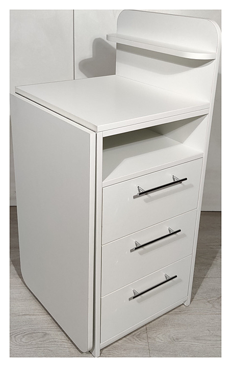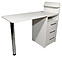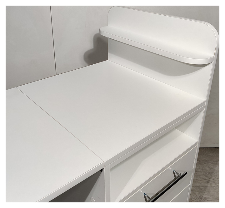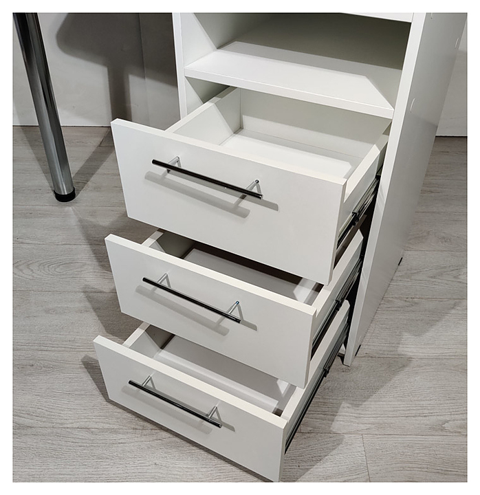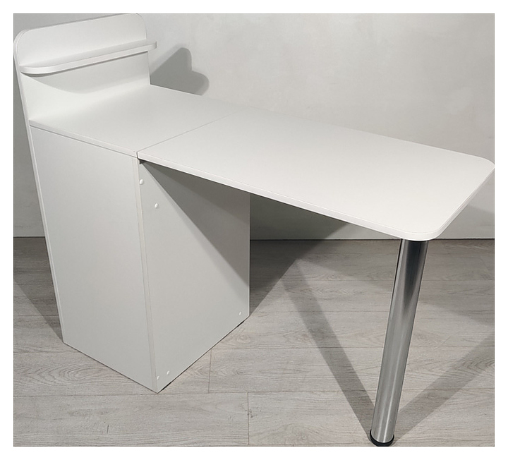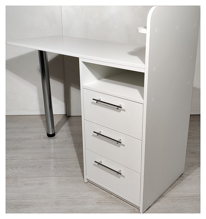 Маникюрный стол PANDA 105 складной предназначен для обустройства рабочего пространства мастера маникюра в косметологических центрах, салонах красоты и домашних студиях ногтевого сервиса. Модель оснащена столешницей, цилиндрической опорой, подставкой для лаков, встроенной тумбой с выдвижными ящиками и открытой полкой. Столешница и тумба изготовлены из ЛДСП, опора - из хромированного металла. Особенности: