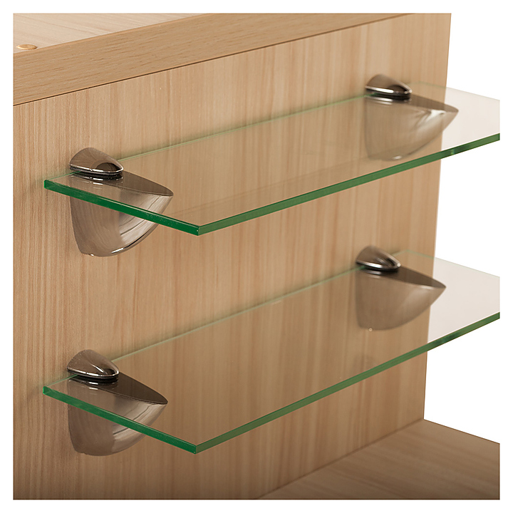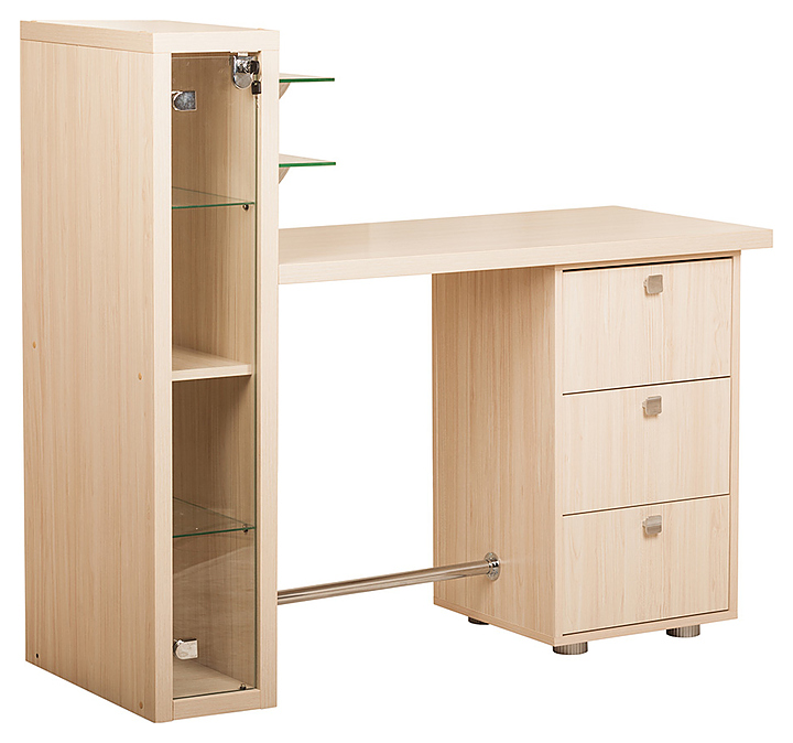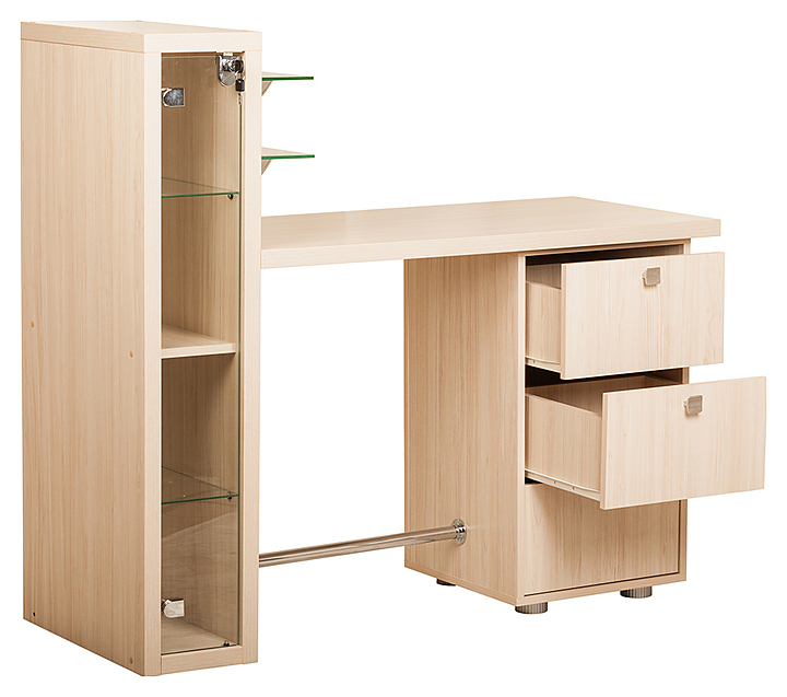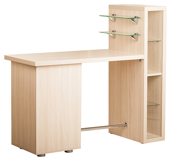 Маникюрный стол PANDA 200 предназначен для обустройства рабочего пространства мастера маникюра в косметологических центрах, салонах красоты и домашних студиях ногтевого сервиса. Модель оснащена столешницей, полками для лаков, нижней перекладиной, встроенной тумбой с выдвижными ящиками и витриной с полками и дверцей. Столешница, тумба и витрина изготовлены из ЛДСП, дверца и задняя спинка витрины - из матированного стекла, полки витрины и полки для лаков - из стекла, нижняя перекладина - из хромированного металла. Особенности: