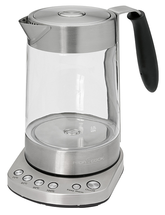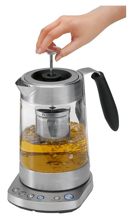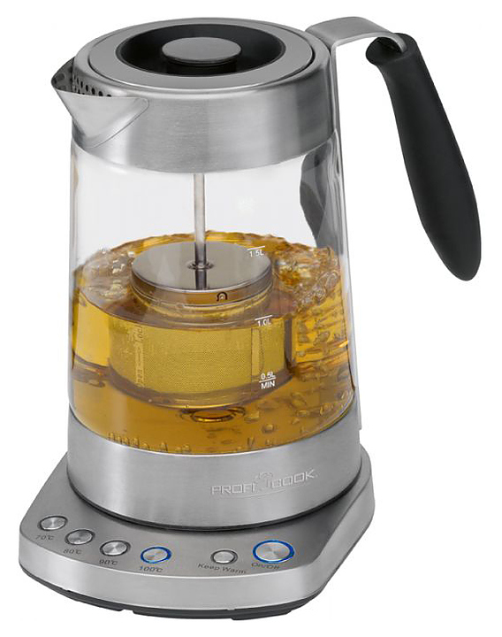 Чайник Profi Cook PC-WKS 1020 G предназначен для подогрева воды, приготовления чая и кофе в частных домах и квартирах. Модель оснащена подставкой с панелью управления, 2 сменными крышками и нескользящей прорезиненной ручкой. Корпус выполнен из нержавеющей стали и термостойкого безопасного стекла, нагревательный элемент - из нержавеющей стали. В комплект поставки входит крышка с чайным фильтром из нержавеющей стали. Особенности:
