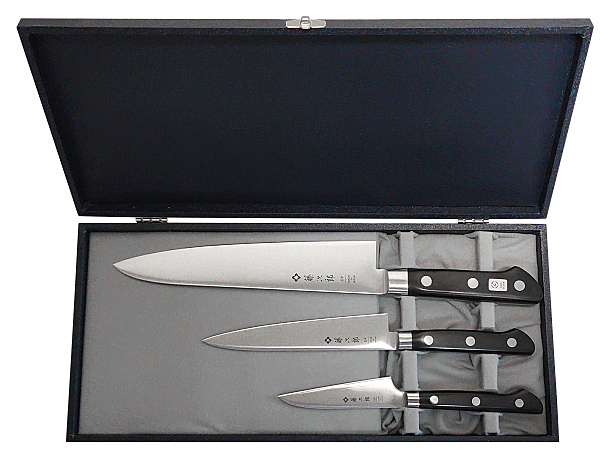 Набор из 3-х ножей Tojiro DP-GIFTSET-A предназначен для работы в домашних условиях и на предприятиях общественного питания. В набор входят поварской шеф нож, универсальный нож. Лезвия ножей выполнены из высокоуглеродистой, износостойкой стали VG10 + 13 Chrome Stainless Steel, эргономичные рукоятки - из стабилизированной эко-древесины. Особенности: