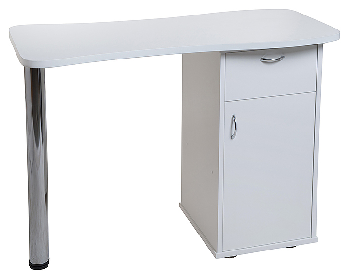 Маникюрный стол PANDA 201 предназначен для обустройства рабочего пространства мастера маникюра в косметологических центрах, салонах красоты и домашних студиях ногтевого сервиса. Модель оснащена столешницей, цилиндрической опорой и встроенной тумбой с полками, дверцей и выдвижным ящиком. Столешница и тумба изготовлены из ЛДСП, опора - из хромированного металла. Особенности: