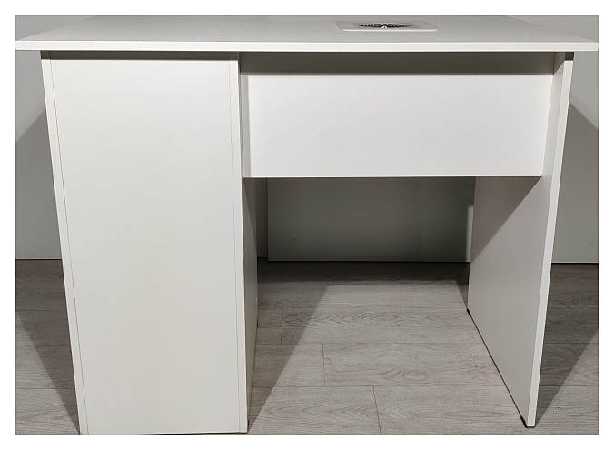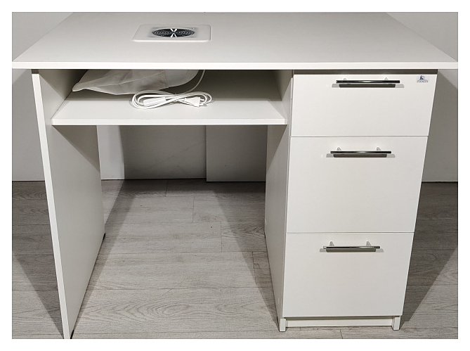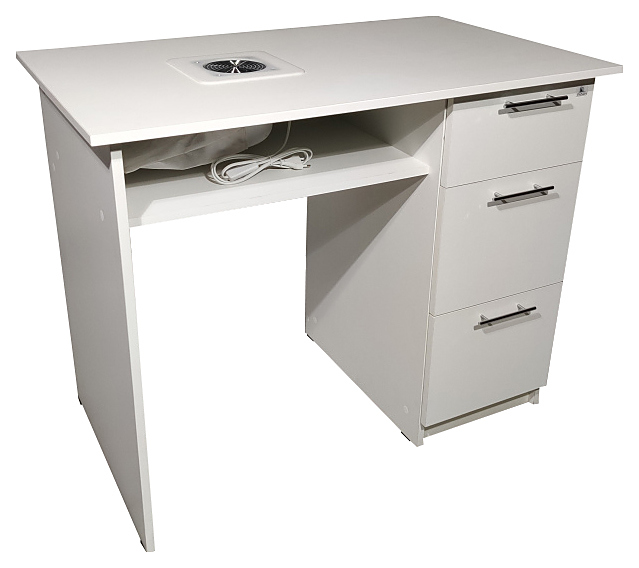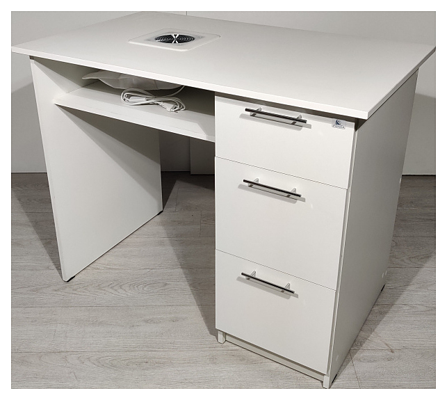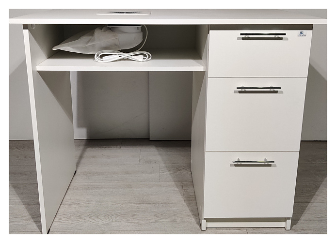 Маникюрный стол PANDA 208 со встроенной вытяжкой предназначен для обустройства рабочего пространства мастера маникюра в косметологических центрах, салонах красоты и домашних студиях ногтевого сервиса. Модель оснащена столешницей с открытой полкой и встроенной тумбой с выдвижными ящиками. Столешница и тумба изготовлены из ЛДСП. Особенности: