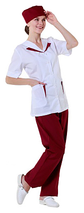 Женская блузка Клен 00009, р.48 используется поварами на предприятиях общественного питания и торговли. Модель украшена пуговицами и бордовыми вставками у воротников и карманов. Изделие сшито из материала ТиСи, состоящего на 35% из хлопка, на 65% из полиэстера. Блузка может использоваться вместе с универсальными брюками и женскими сабо. Дополнительные характеристики: