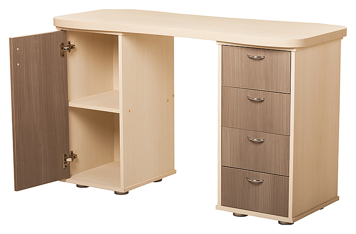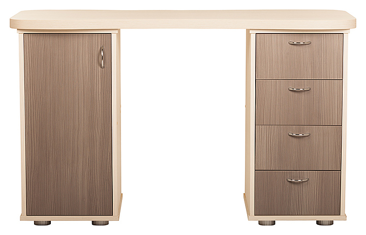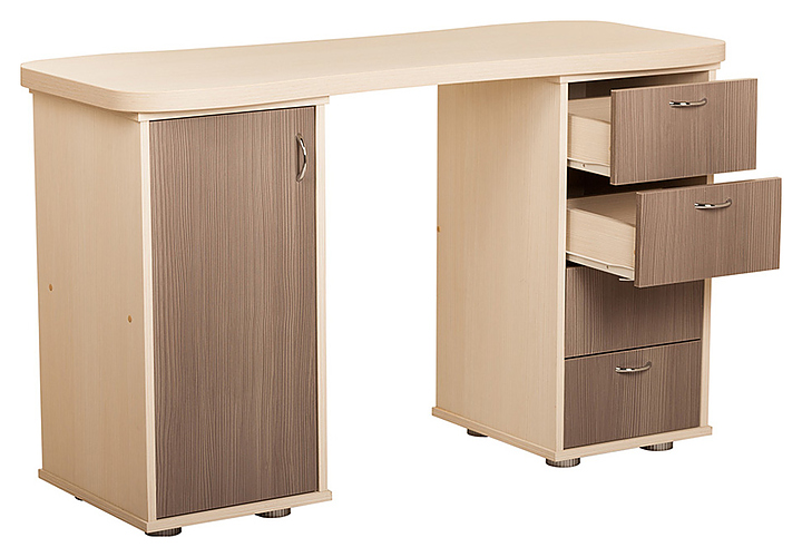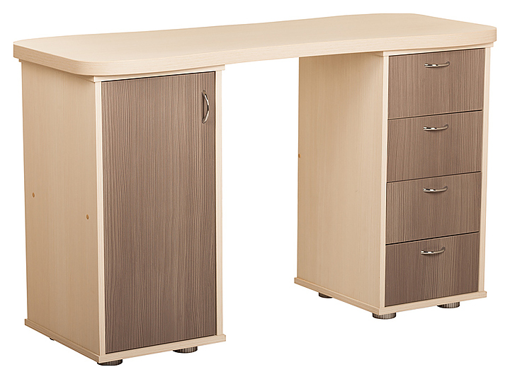 Маникюрный стол PANDA 217 с двумя тумбами предназначен для обустройства рабочего пространства мастера маникюра в косметологических центрах, салонах красоты и домашних студиях ногтевого сервиса. Модель оснащена столешницей, тумбой с выдвижными ящиками и тумбой с полкой и дверцей. Столешница и тумбы изготовлены из ЛДСП. Особенности: