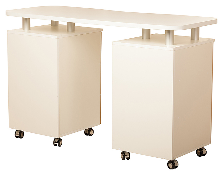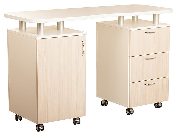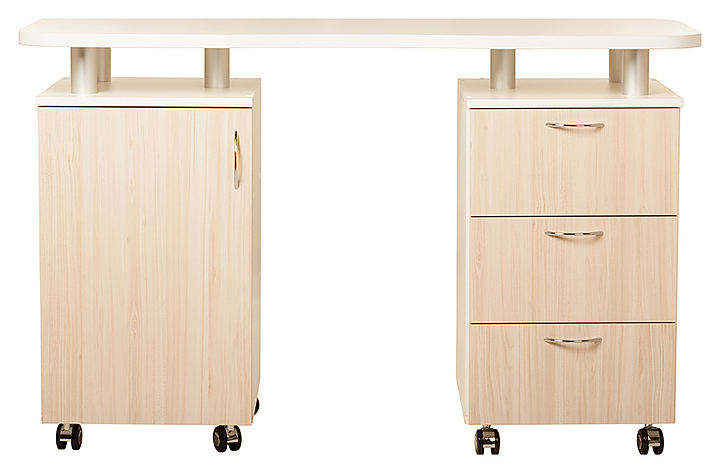 Маникюрный стол PANDA 219 с двумя тумбами предназначен для обустройства рабочего пространства мастера маникюра в косметологических центрах, салонах красоты и домашних студиях ногтевого сервиса. Модель оснащена столешницей, тумбой с выдвижными ящиками, тумбой с полками и дверцей и колесами. Столешница и тумбы изготовлены из ЛДСП. Особенности:
