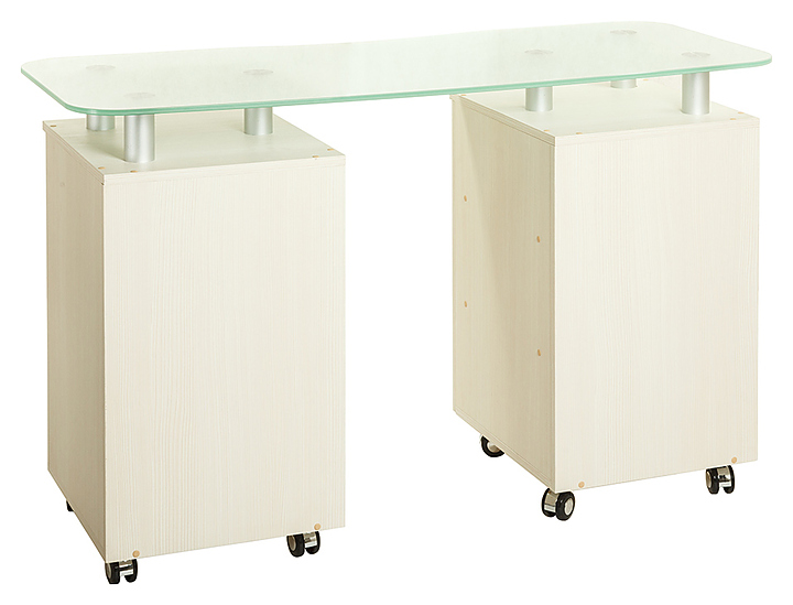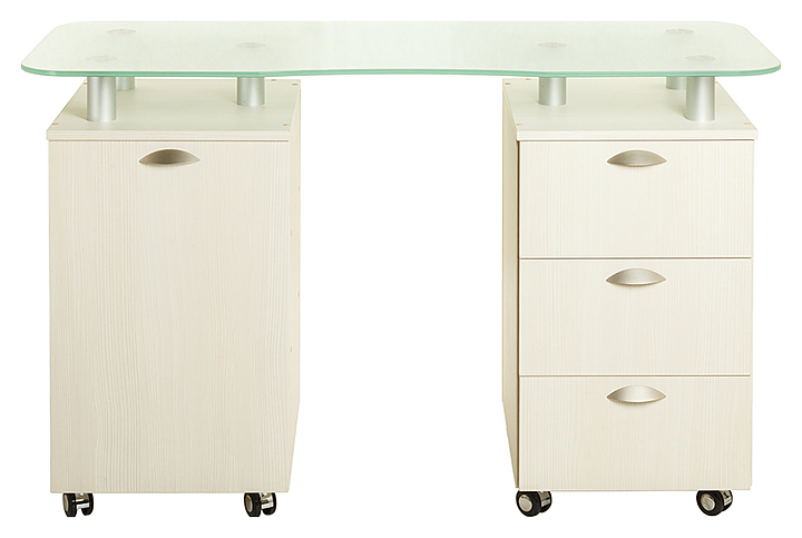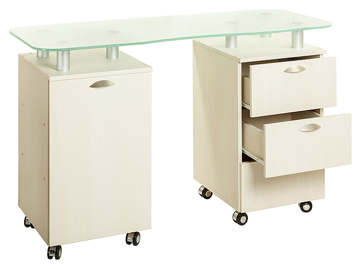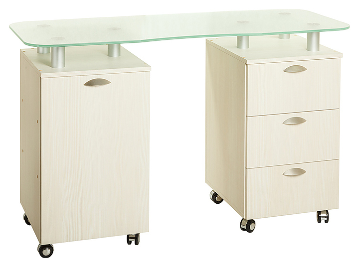 Маникюрный стол PANDA 219 S с двумя тумбами предназначен для обустройства рабочего пространства мастера маникюра в косметологических центрах, салонах красоты и домашних студиях ногтевого сервиса. Модель оснащена столешницей, тумбой с выдвижными ящиками, тумбой с полками и дверцей и колесами. Столешница изготовлена из стекла, тумбы - из ЛДСП. Особенности: