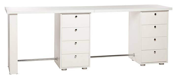 Маникюрный стол PANDA Глория двойной предназначен для обустройства рабочего пространства мастера маникюра в косметологических центрах, салонах красоты и домашних студиях ногтевого сервиса. Модель оснащена столешницами, нижними перекладинами и встроенными тумбами с выдвижными ящиками. Столешницы и тумбы изготовлены из ЛДСП, нижние перекладины - из хромированного металла. Модель состоит из основного стола PANDA Глория и приставного стола PANDA Глория. Особенности: