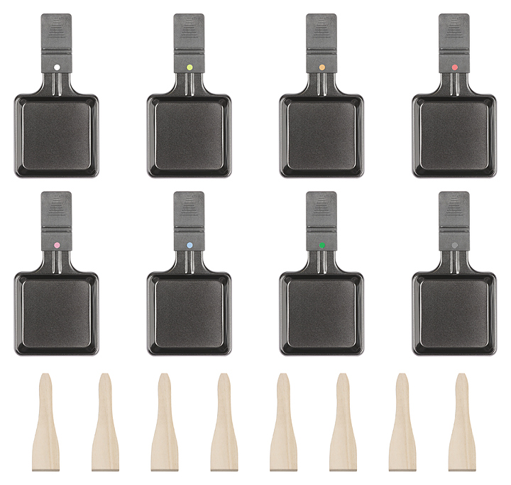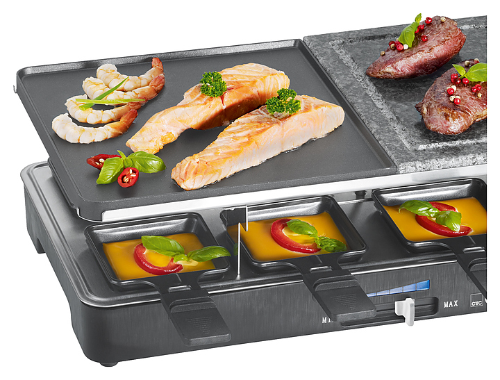Гриль-раклетница Clatronic RG 3518 предназначен для жарки мяса, рыбы и овощей с одновременным плавлением сыра в частных домах, квартирах, отелях и офисах. Модель оснащена термостатом с синей подсветкой и съемными пластинами для гриля. В комплект поставки входят 8 порционных сковородок с антипригарным покрытием, 8 деревянных лопаток, пластина для гриля из натурального камня и двусторонняя (гладкая / рифленая) литая пластина с антипригарным покрытием. Особенности: