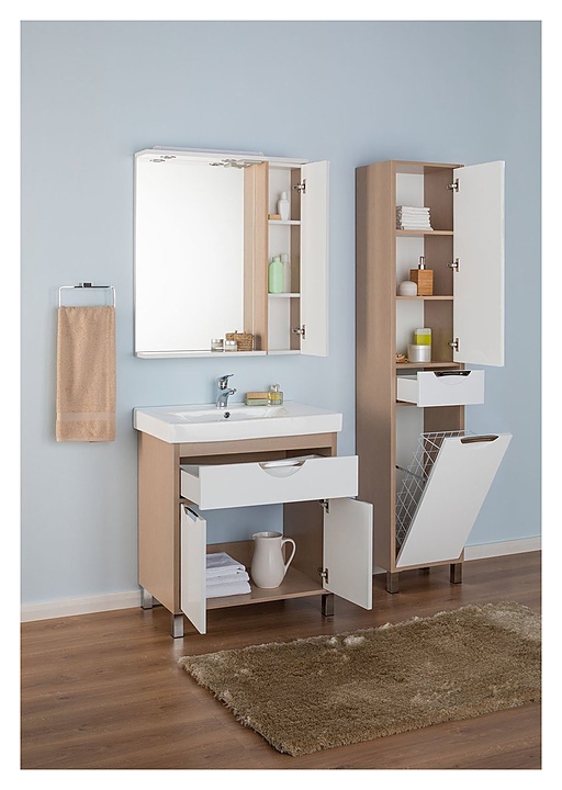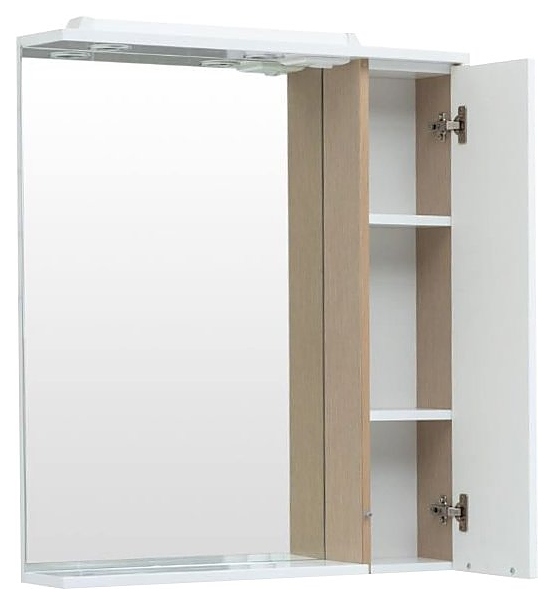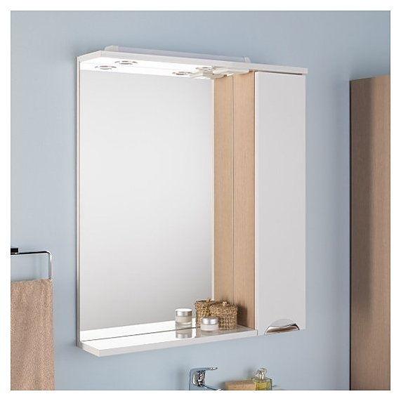 Зеркало Aquanet Гретта 70 от российского бренда дополнит интерьер ванной комнаты. Благодаря подвесной конструкции модель не занимает много места, что позволяет экономить пространство, а также облегчает уборку. Зеркало оснащено подсветкой, компактной полочкой и боковым шкафчиком для размещения аксессуаров. Корпус изделия выполнен из влагостойкой ЛДСП, а фасад из МДФ с покрытием глянцевой краской. Особенности: