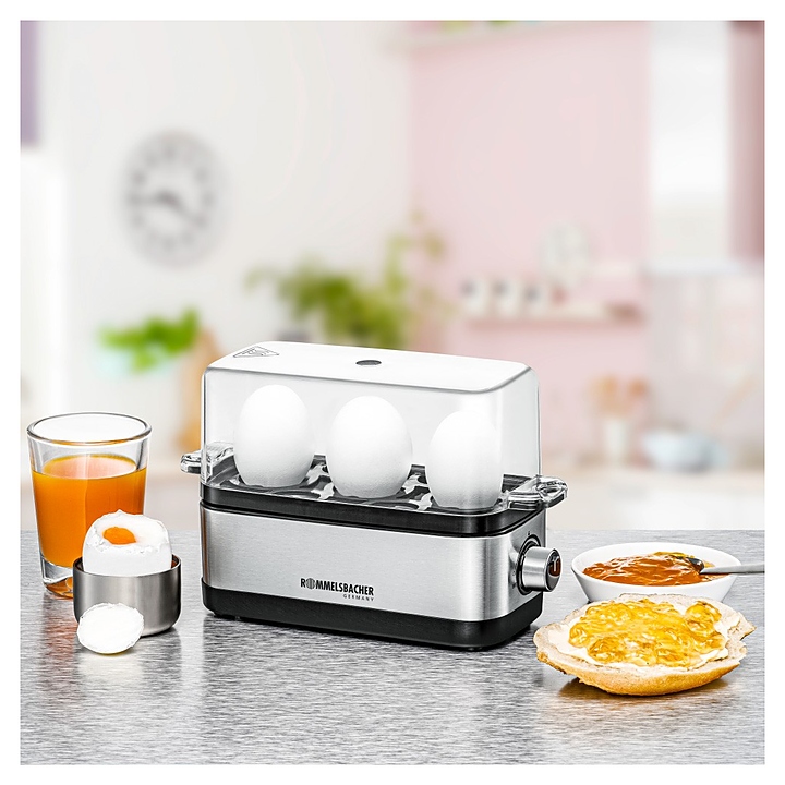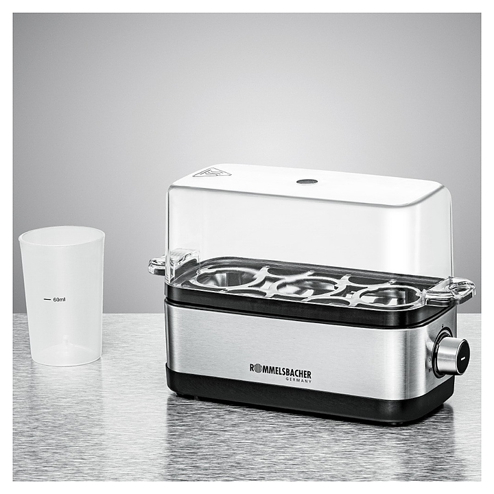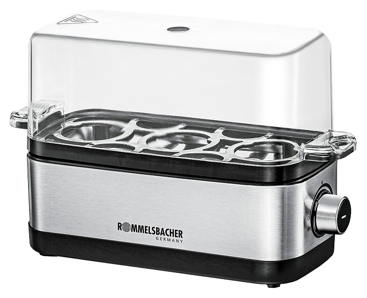Яйцеварка Rommelsbacher ER 300 используется в частных домах, квартирах, отелях и офисах для приготовления куриных яиц до выбранной степени готовности. Модель оснащена поворотным регулятором времени варки, световым индикатором работы и съемной прозрачной крышкой. Корпус и нагревательная чаша выполнены из нержавеющей стали. В комплект поставки входит мерный стакан с приспособлением для накалывания яиц и съемный держатель для яиц. Особенности: