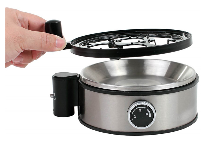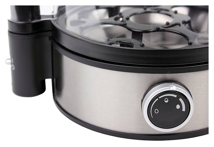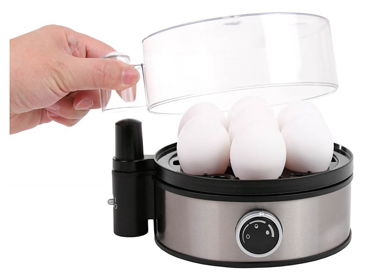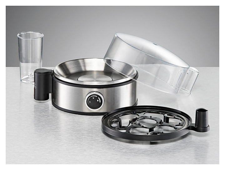 Яйцеварка Rommelsbacher ER 400 используется в частных домах, квартирах, отелях и офисах для приготовления куриных яиц до выбранной степени готовности. Модель оснащена поворотным регулятором времени варки, выключателем питания с контрольной лампой и съемной прозрачной крышкой. Корпус и нагревательная чаша выполнены из нержавеющей стали. В комплект поставки входит мерный стакан с приспособлением для накалывания яиц и съемный держатель для яиц. Особенности: