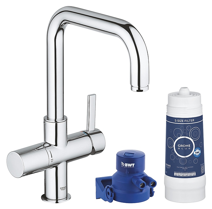 Смеситель для кухни Grohe Blue Pure 120438 предназначен для подачи и очистки водопроводной воды. Модель оснащена поворотным трубкообразным изливом. Смеситель выполнен из металла с хромированным покрытием StarLight, устойчивым к царапинам и обеспечивающим блеск на много лет. В комплект поставки входят смеситель, фильтр Blue S-Size 40404001 с головкой фильтра 64508001. Модель совместима с фильтрами S-Size 40404001, M-Size 40430001, L-Size 40412001, Blue 40547001 с активированным углем и 40691002 с магнием и цинком. Особенности: