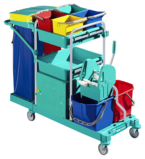 Уборочная тележка TTS GREEN 500 предназначена для профессиональной влажной уборки в производственных и офисных центрах, гостиницах и супермаркетах. Модель оснащена каркасом со стойкой на колесах, ручкой, верхней и нижней полкой, встроенным контейнером с ключом, держателем для мешка для мусора, ведрами и отжимом. Каркас, полки, ведра, встроенный контейнер и держатель для мешка для мусора изготовлены из полипропилена и ударопрочного пластика, стойка - из стали. Особенности: