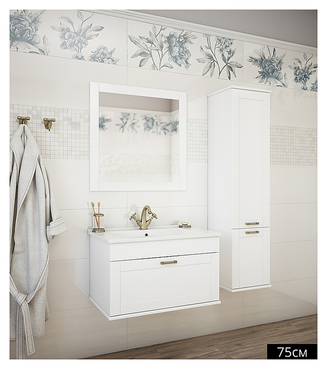 Гарнитур Sanflor Ванесса выполнен в классическом стиле. Благодаря простоте классики и четкости деталей мебель станет украшением любой ванной комнаты. В комплект входит тумба под раковину, раковина Kirovit Оскар 75, левосторонний пенал и зеркало. Тумба оснащена 1 выдвижным ящиком. Пенал оснащен 2 дверцами. Раковина имеет слив-перелив и одно отверстие для смесителя, расположенное по центру. Корпус мебели выполнен из влагостойкой ЛДСП с эмалевым покрытием. Особенности: