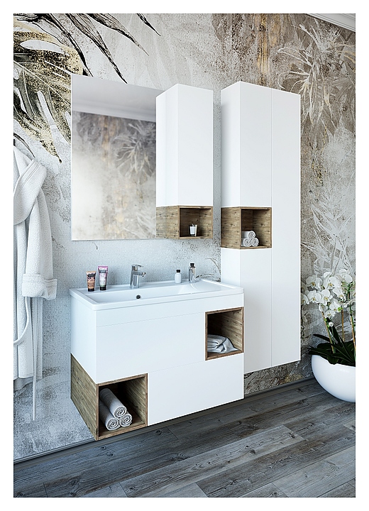 Гарнитур Sanflor Даллас выполнен в скандинавском стиле. Благодаря ассиметричности и оригинальному дизайну мебель станет украшением любой ванной комнаты. В комплект входит тумба под раковину, раковина Kirovit Фостер 80П и зеркало. Тумба оснащена 2 выдвижными ящиками с функцией push-to-open и 2 открытыми полками, зеркало - шкафчиком с 1 дверцей и 1 открытой полкой. Раковина имеет слив-перелив и одно отверстие для смесителя, расположенное по центру. Корпус мебели выполнен из влагостойкой ЛДСП с эмалевым покрытием. Особенности: