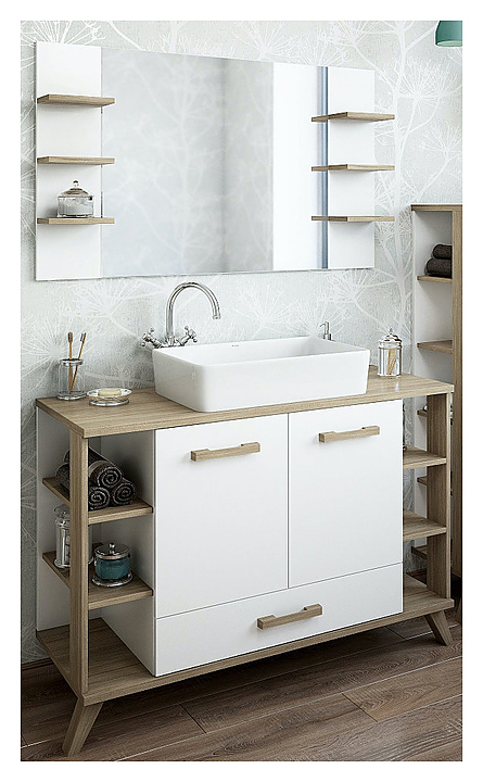 Гарнитур Sanflor Ингрид выполнен в ретро стиле. Благодаря яркому и харизматичному дизайну мебель станет украшением любой ванной комнаты. В комплект входит тумба под раковину, раковина Kirovit Олимпия 56 и зеркало. Тумба оснащена 2 дверцами, 1 ящиком и 6 открытыми полочками. Раковина без отверстия под смеситель и перелива. Зеркало оснащено 6 открытыми полочками. Корпус мебели выполнен из ЛДСП с эмалевым покрытием. Особенности: