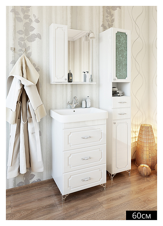 Гарнитур Sanflor Ксения выполнен в классическом стиле. Благодаря изысканному стилю мебель станет украшением любой ванной комнаты. В комплект входит тумба под раковину, раковина Santek Тигода 60 и правостороннее зеркало. Тумба оснащена 4 ящиками с механизмом плавного закрытия, зеркало - шкафчиком и светильником. Раковина имеет слив-перелив и одно отверстие для смесителя, расположенное по центру. Корпус мебели выполнен из МДФ с лаковым покрытием. Особенности: