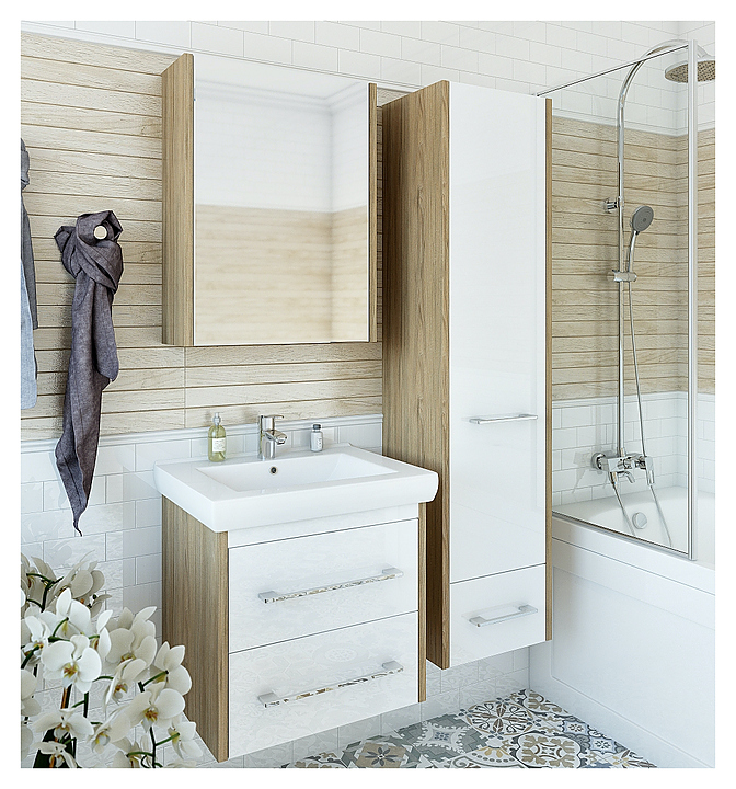 Гарнитур Sanflor Ларго выполнен в скандинавском стиле. Благодаря простоте и стильному внешнему виду мебель станет украшением любой ванной комнаты. В комплект входит тумба под раковину, раковина Kirovit Фостер 70, правостороннее зеркало и правосторонний пенал. Тумба оснащена 3 выдвижными ящиками с механизмом плавного закрытия, зеркало - шкафчиком. Раковина имеет слив-перелив и одно отверстие для смесителя, расположенное по центру. Пенал оснащен 1 дверцей с механизмом плавного закрывания, 3 деревянными полками и 1 выдвижным ящиком. Корпус мебели выполнен из влагостойкой ЛДСП с эмалевым покрытием. Смеситель в комплект поставки не входит и приобретается отдельно. Особенности: