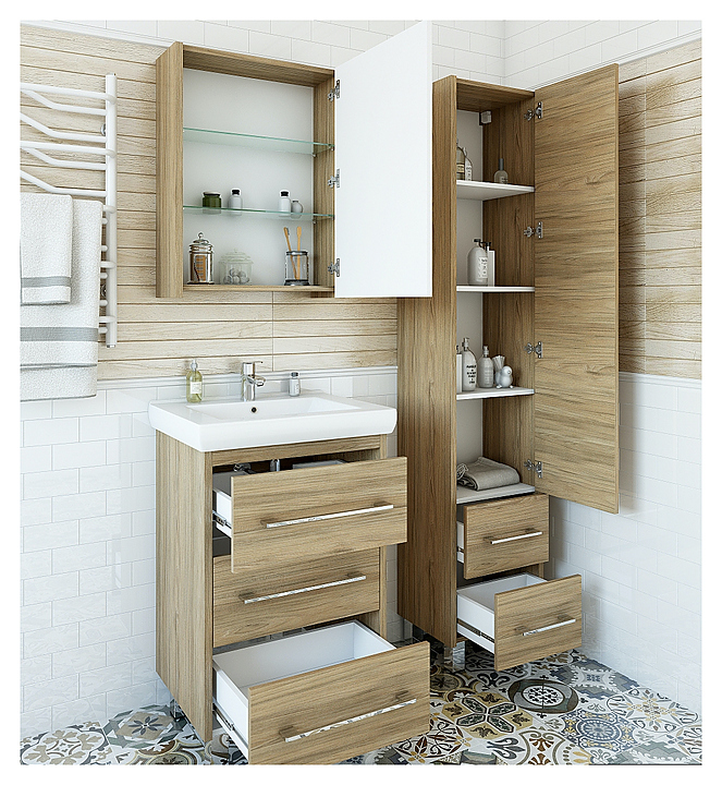 Гарнитур Sanflor Ларго выполнен в скандинавском стиле. Благодаря простоте и стильному внешнему виду мебель станет украшением любой ванной комнаты. В комплект входит тумба под раковину, раковина Kirovit Фостер 70, левостороннее зеркало и левосторонний пенал. Тумба оснащена 3 выдвижными ящиками с механизмом плавного закрытия, зеркало - шкафчиком. Раковина имеет слив-перелив и одно отверстие для смесителя, расположенное по центру. Пенал оснащен 1 дверцей с механизмом плавного закрывания, 3 деревянными полками и 2 выдвижными ящиками. Корпус мебели выполнен из влагостойкой ЛДСП с эмалевым покрытием. Смеситель в комплект поставки не входит и приобретается отдельно. Особенности: