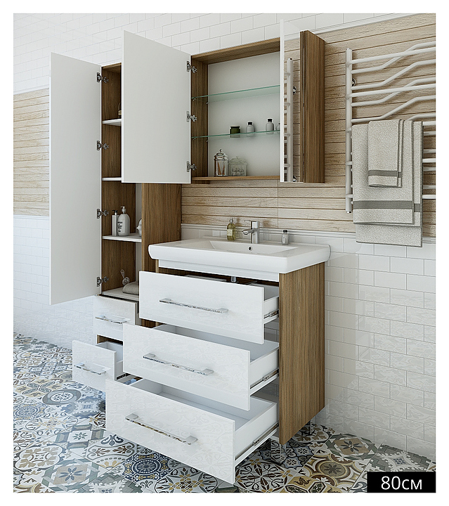 Гарнитур Sanflor Ларго выполнен в скандинавском стиле. Благодаря простоте и стильному внешнему виду мебель станет украшением любой ванной комнаты. В комплект входит тумба под раковину, раковина Kirovit Фостер 80, правостороннее зеркало и левосторонний пенал. Тумба оснащена 3 выдвижными ящиками с механизмом плавного закрытия, зеркало - шкафчиком. Раковина имеет слив-перелив и одно отверстие для смесителя, расположенное по центру. Пенал оснащен 1 дверцей с механизмом плавного закрывания, 3 деревянными полками и 2 выдвижными ящиками. Корпус мебели выполнен из влагостойкой ЛДСП с эмалевым покрытием. Особенности:
