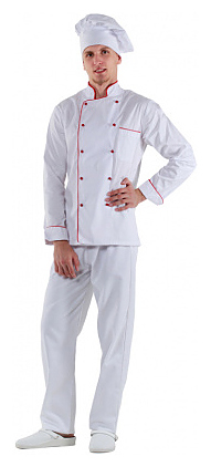 Куртка шеф-повара Клен 00002 используется поварами на предприятиях общественного питания и торговли. Модель оснащена застежкой на пуклях, карманом и манжетами на рукавах, декорирована цветным кантом. Изделие сшито из материала Сатори, состоящего на 55% из хлопка, на 45% из полиэстера, с водоотталкивающей пропиткой ВО. Куртка может использоваться вместе с универсальными брюками и сабо. Дополнительные характеристики:
