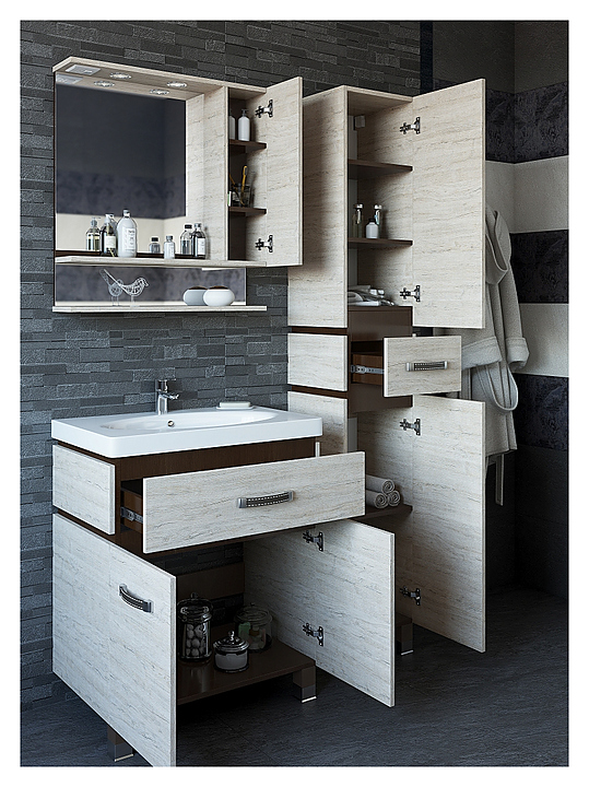 Гарнитур Sanflor Техас выполнен в современном стиле. Благодаря функциональности и эргономичным формам мебель станет украшением любой ванной комнаты. В комплект входит тумба под раковину, раковина Cersanit COMO 60, левостороннее зеркало и левосторонний пенал. Тумба оснащена 2 дверцами и 1 выдвижным ящиком, зеркало - шкафчиком, подсветкой и 2 открытыми полочками, пенал - 2 дверцами и 1 ящиком. Раковина имеет слив-перелив и одно отверстие для смесителя, расположенное по центру. Корпус мебели выполнен из влагостойкой ЛДСП с эмалевым покрытием. Смеситель в комплект поставки не входит и приобретается отдельно. Особенности: