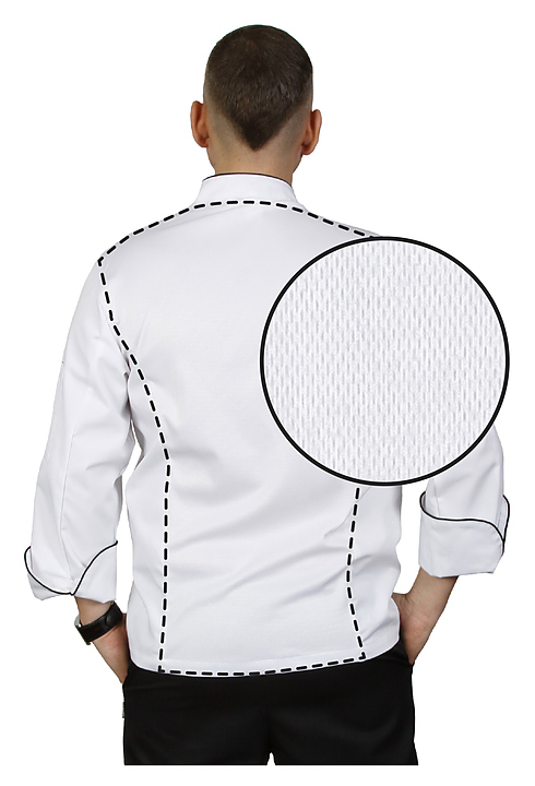 Куртка шеф-повара Клен 00012 Премиум используется поварами на предприятиях общественного питания и торговли. Модель оснащена застежкой на кнопках, сетчатой вставкой на спинке и манжетами на рукавах, декорирована цветным кантом. Изделие сшито из материала, состоящего на 35% из хлопка, на 65% из полиэстера. Фурнитура выполнена из нержавеющей стали, внутренние кнопки - никелированные. Куртка может использоваться вместе с универсальными брюками и сабо. Особенности: