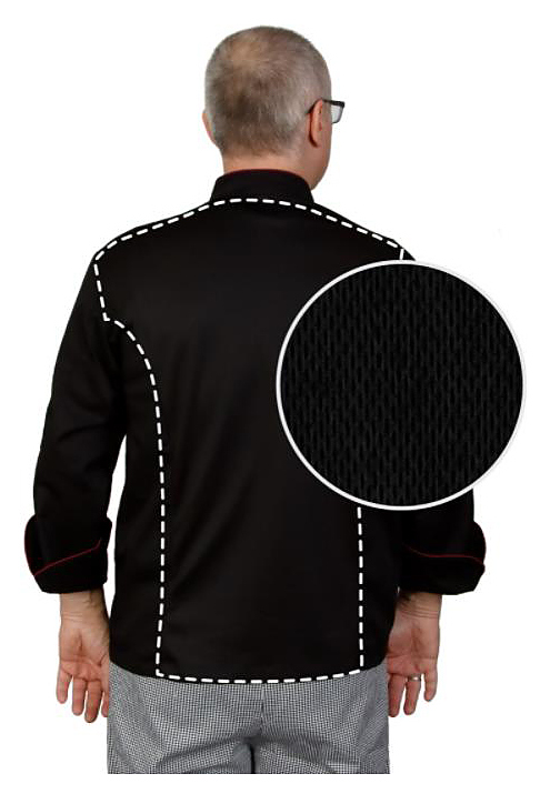 Куртка шеф-повара Клен 00012 Премиум используется поварами на предприятиях общественного питания и торговли. Модель оснащена застежкой на кнопках, сетчатой вставкой на спинке и манжетами на рукавах, декорирована цветным кантом. Изделие сшито из материала, состоящего на 35% из хлопка, на 65% из полиэстера. Фурнитура выполнена из нержавеющей стали, внутренние кнопки - никелированные. Куртка может использоваться вместе с универсальными брюками и сабо. Особенности: