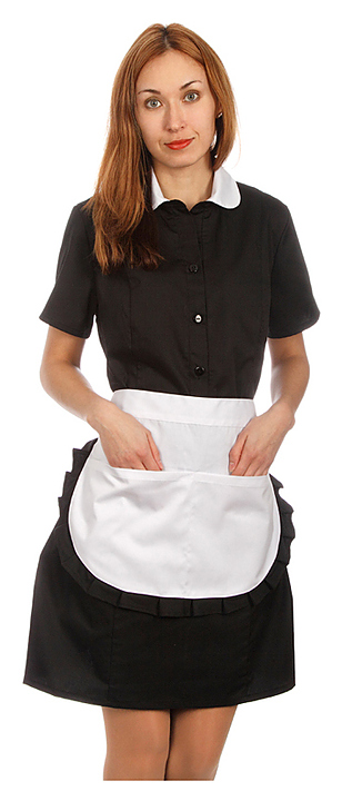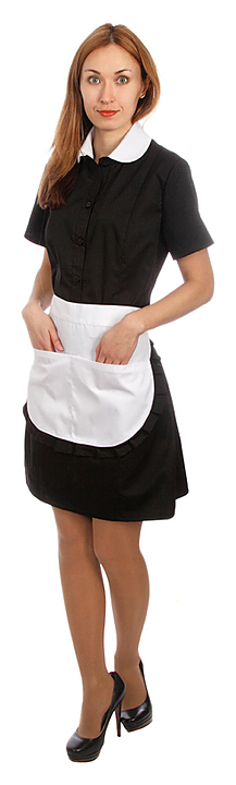 Платье с фартуком Клен 00004 используется горничными в отелях и частных домах. Модель оснащена застежкой на пуговицах, расположенной на груди до пояса и съемным воротником на пуговицах. Изделие сшито из материала ТиСи, состоящего на 35% из хлопка, на 65% из полиэстера. В комплект поставки входит фартук белого цвета. Особенности: